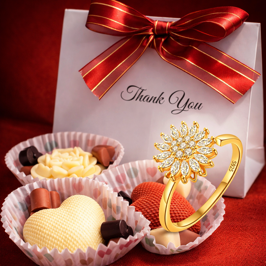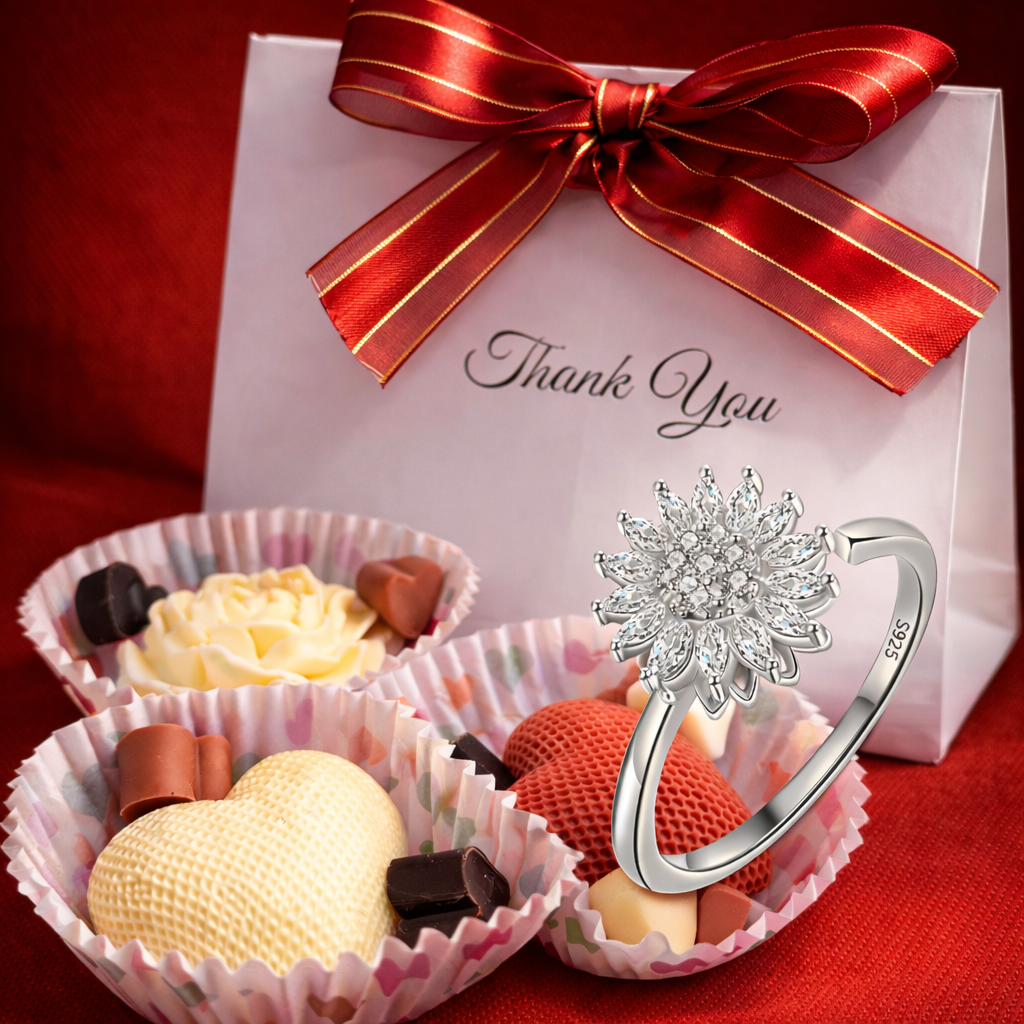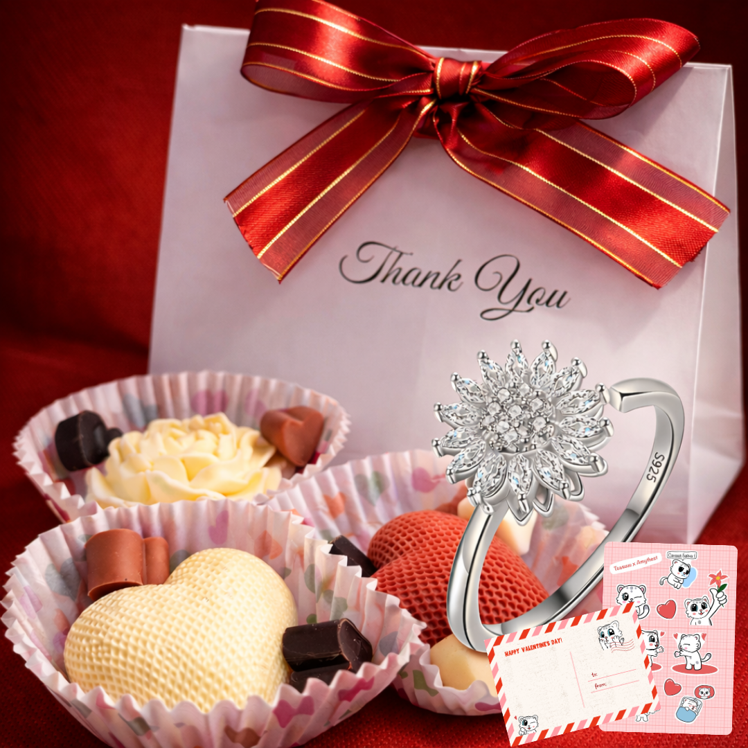 S925 сорьцтой Nature Spin Ring мөнгөн бөгж, амттай шоколад болон Tsasuuu-гийн онцгой sticker, postcard-ийг нэг дор багтаасан.