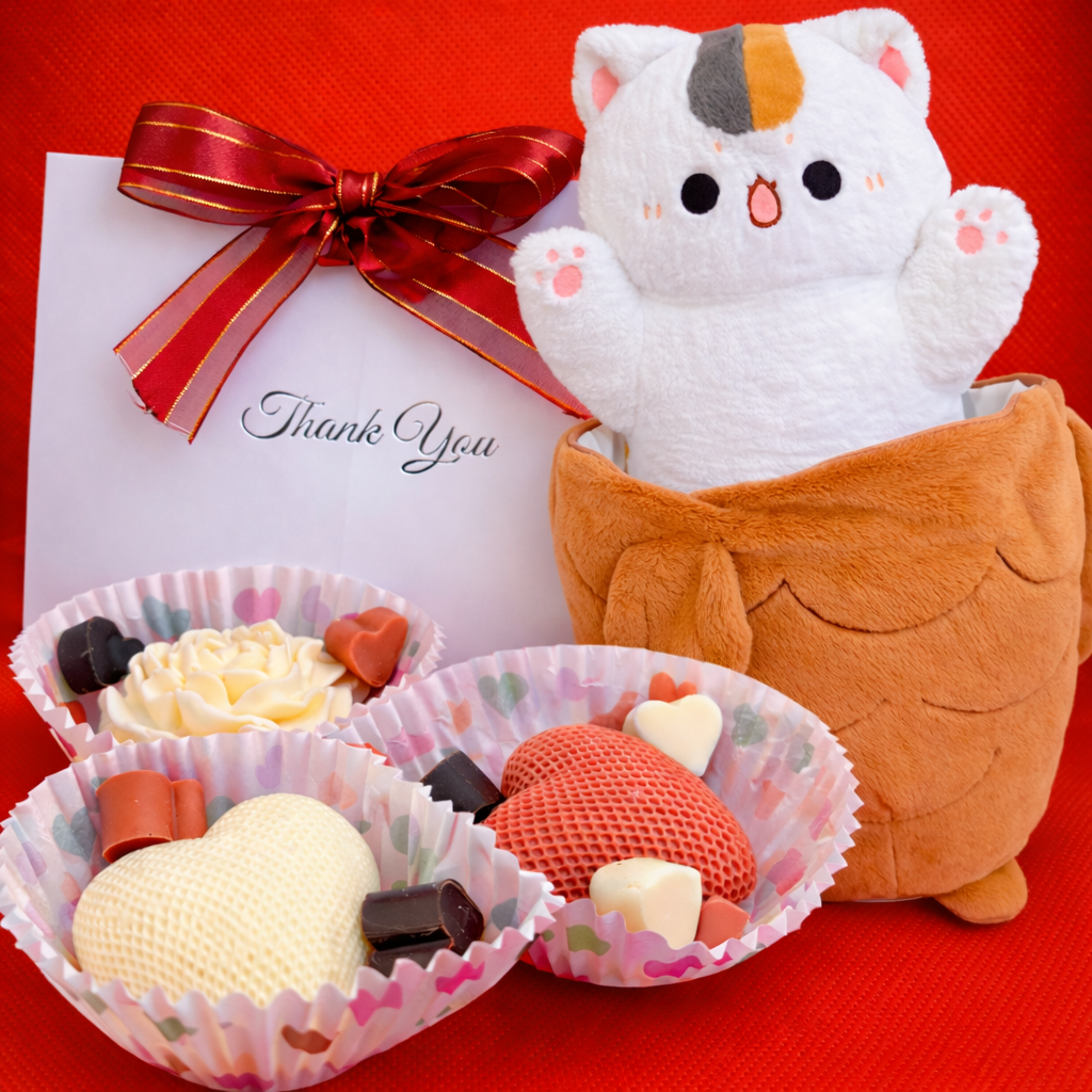 Зөөлөн, тэврэхэд тухтай 60см Taiyaki Cat / Carrot Bunny plush, амттай шоколад болон Tsasuuu-гийн онцгой sticker, postcard-ийг нэг дор багтаасан.